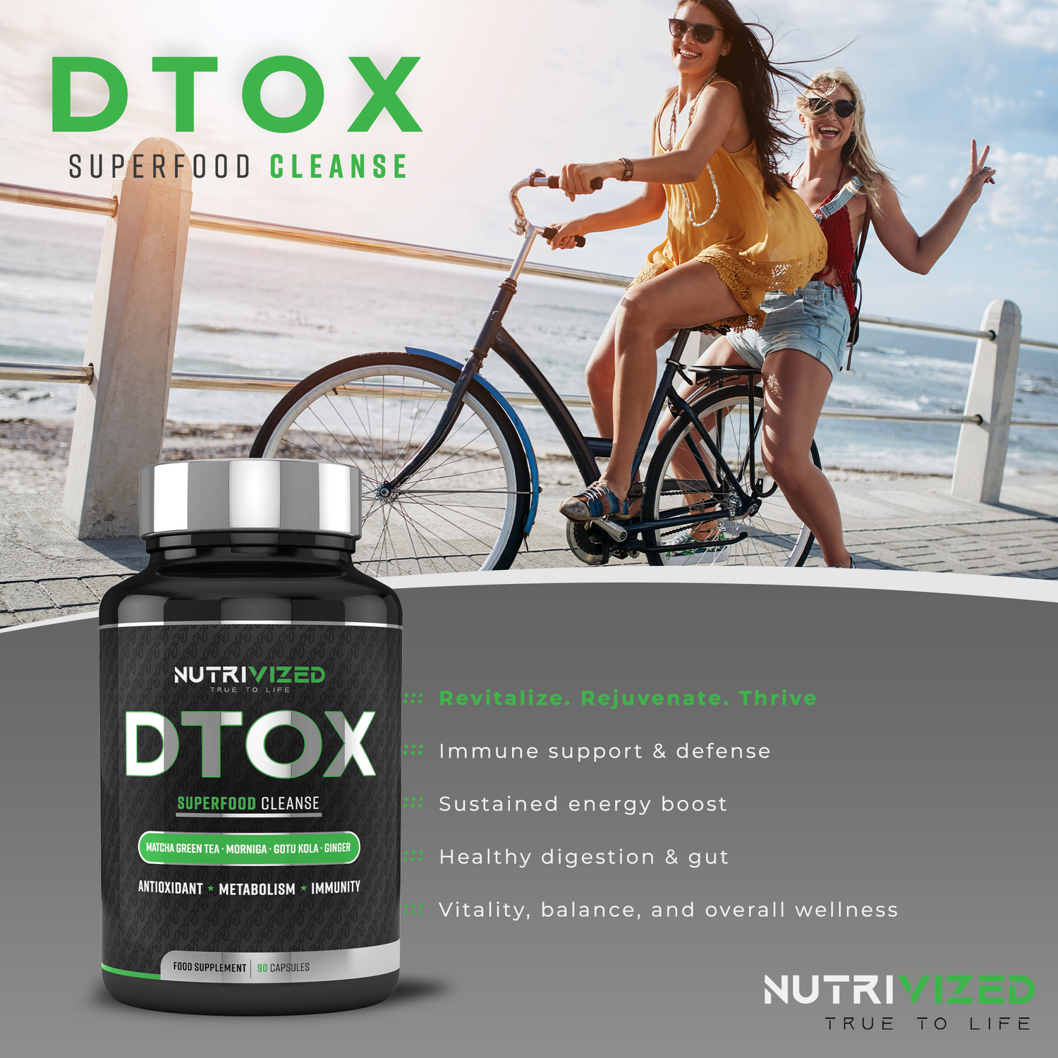 Nutrivized Detox, a transformative blend of Matcha Green Tea, Moringa, Gota Kula, and Ginger Extract meticulously crafted to support your body's natural detoxification processes while boosting your immune system. Nutrivized Detox is the ultimate companion for those seeking to cleanse and rejuvenate their body. Each carefully selected ingredient brings its own unique benefits to this powerful formulaair text with an image to focus on your chosen product, collection, or blog post. Add details on availability, style, or even provide a review.